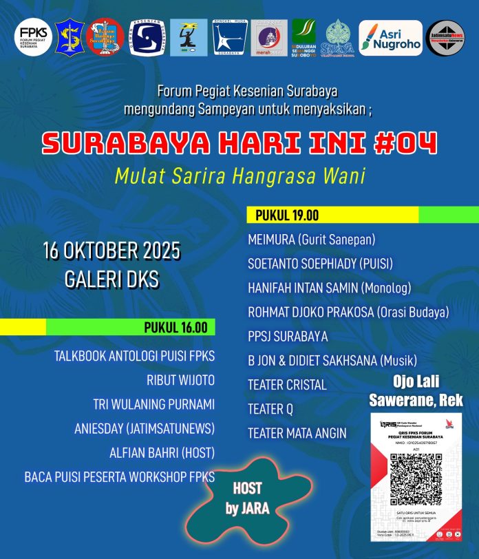 SURABAYA, arekMEMO.Com – Setelah absen dua bulan, Forum Pegiat Kesenian Surabaya (FPKS) kembali menyelenggarakan programnya pada Oktober 2025, dengan menggelar dua sesi acara pada hari Rabu 16 Oktober besok di Galeri Dewan Kesenian Surabaya, komplek Balai Pemuda, Jl. Gubernur Suryo 15 Surabaya.