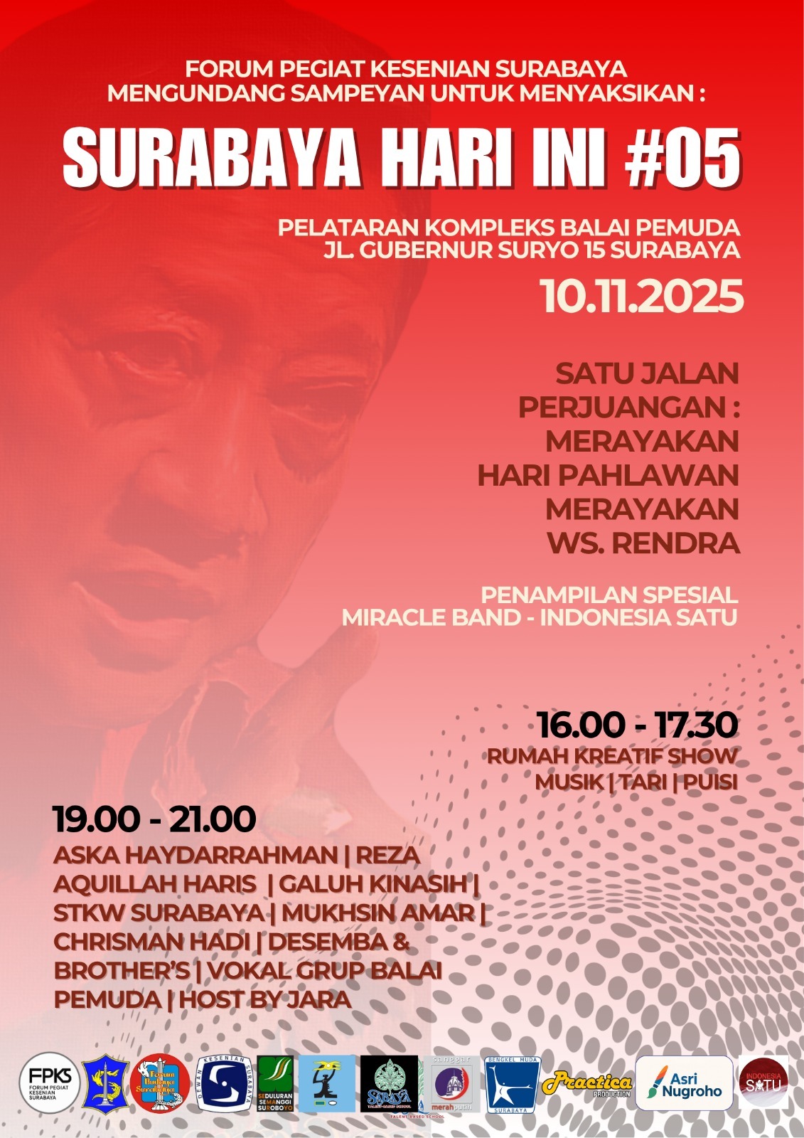 SURABAYA, arekMEMO.Com – Satu Jalan Perjuangan : Merayakan Hari Pahlawan sekaligus merayakan WS. Rendra menjadi tema pagelaran “Surabaya Hari Ini” ke-5 yang diadakan Forum Pegiat Kesenian Surabaya (FPKS) pada tanggal 10 November besok, mulai pukul 16.00 hingga 21.00, di Teras Dewan Kesenian Surabaya, Kompleks Balai Pemuda, Jl. Gubernur Suryo 15 Surabaya.